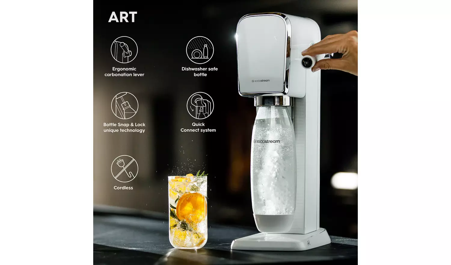 LENGVA NAUDOTI. Naudotis „SodaStream ART“ gazuotų gėrimų aparatu yra nuostabiai paprasta: tiesiog pripildykite butelį vandens, lengvai prijunkite jį prie aparato pasitelkę „SnapLock“ technologiją, nuleiskite svirtį, panorėję įmaišykite mėgstamo sirupo ir gardžiuokitės!